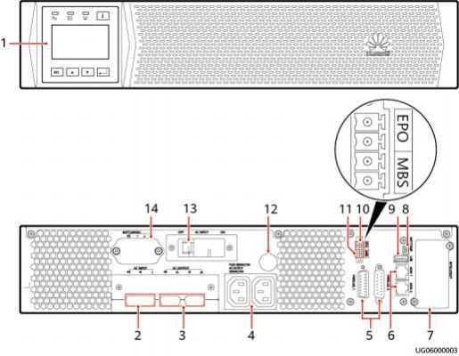 (9)USB接口(支持安 ( 10)EPO接口 ( 11 )维修旁路模式接 ( 12)保险管座 全保护机制) 口( MBS)