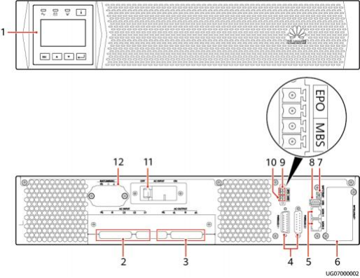 (9)EPO接口 ( 10)维修旁路模式接 ( 11 )输入空开 ( 12)电池端口 口( MBS)