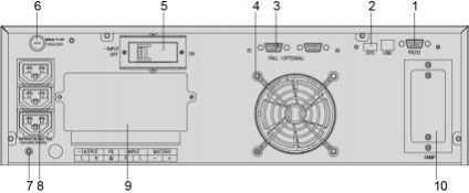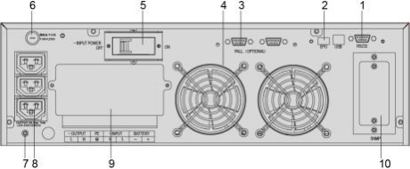 (1)RS232 (2)EPO (3)并联接口 (4)风扇 (5)市电输入空开 (6)保险丝 (7)防雷接地 (8)交流输出插座 (9)接线排盖板 (10)SNMP 盖板