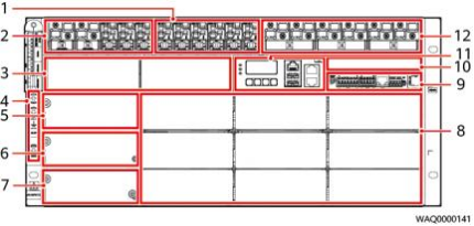 (1) LLVD2空开 (2) LLVD1空开 (3) iDCDU100D1安装空间 (4) 接地螺钉 (5) 交流输出模块安装空间 (6) 交流输入模块1安装空间 (7) 交流输入模块2安装空间 (8) 模块安装空间 (9) UIM05B1 (10) 扩展模块安装空间 (11) SMU02C (12) 电池空开