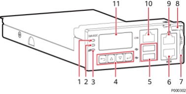 ( 1 )运行指示灯 (2)次要告警指示灯 (3)重要告警指示灯 (4)按键 (5)USB接口(该端口支持安 (6)通信口RS485/RS232 全保护机制) ( 7 )把手 (8)拨销 (9)通信口FE ( 10)通信口CAN ( 11 )液晶显示屏