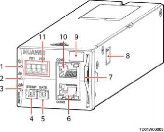( 1 )运行指示灯 (2)次要告警指示灯 (3)重要告警指示灯 (4)电池温度检测接口 (5)门磁检测接口 (6)通信口COM2/CAN ( 7 )把手 (8)拨码开关 (9)SN码位置 ( 10)通信口COM1 ( 11 )干接点接口
