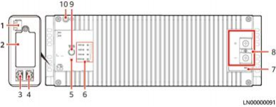 ● 并联使用:支持多组锂电池并联,CAN通信最大支持32组, RS485通信最大支持 16组。 ● 均衡功能:支持电芯实时均衡功能。 ● 电子标签:支持身份识别。 ● 防盗功能:配合华为特定的电源系统可支持防盗。 ● 强制下电功能:断开PWR外部电源,长按MANUAL ON/OFF按钮5秒,电池模块 能强制下电。 ● 维护模式:用于锂电池更换。长按MANUAL ON/OFF按钮15秒,进入维护模式确 保锂电池更换操作安全可靠。 ● 激活功能:支持三种激活方式,PWR激活、功率口激活、 MANUAL ON/OFF激 活。 外观与接口