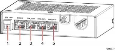 ( 1 )电源输入接口 (2)通信口COM_IN (3)通信口COM_OUT1 (4)通信口COM_OUT2 (5)通信口COM_OUT3