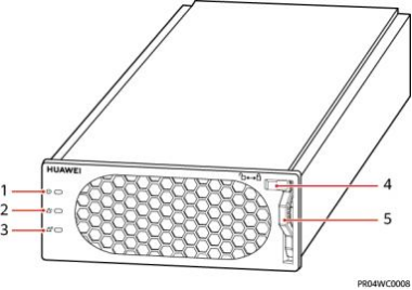 ( 1 )电源指示灯 (2)告警指示灯 (3)故障指示灯 (4)拨销 (5)把手