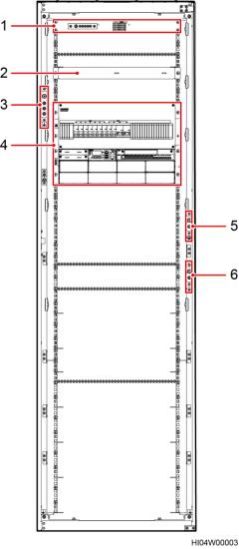 (1)温控供电转接盒 (2)走线面板 (3)设备接地排 (4)DCDU-400AN2 (5)主接地排 (6)设备接地排