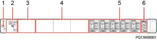 ( 1 )接地螺丝 (2)输入端子 (3)监控模块安装空间 (4)整流模块安装空间 (5)直流输出开关和接线端子 (6)电池开关和接线端子 |