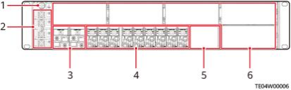 ( 1 )接地螺丝 (2)输入端子 (3)电池空开 (4)负载空开 (5)监控模块安装空间 (6)整流模块安装空间 |