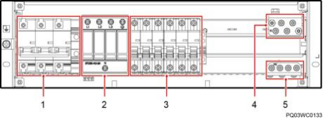 (1)交流输入空开及端子 (2)交流防雷器 (3)交流输出空开 (4)N 接线排 (5)PE 排