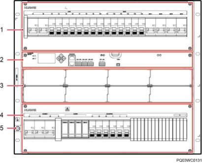 (1)直流配电单元 (2)SMU06C1 (3)整流模块安装空间 (4)交流配电单元 (5)接地螺丝