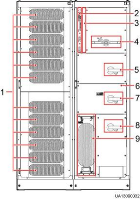 (1)功率单元 (2)控制单元 (3)选配卡插槽(假面板后方) (4)主路输入开关 (5)输出开关 (6)配电单元盖板(4 块) (7)维修旁路开关 (8)旁路输入开关 (9)旁路单元