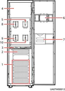 ( 1 )功率单元 (2)旁路单元 (3)控制单元 (4)配电插框盖板 (5)维修旁路开关 (6)监控显示单元 ( 7 )资料夹 (8)旁路输入开关 (9)主路输入开关 ( 10)输出开关 - -
