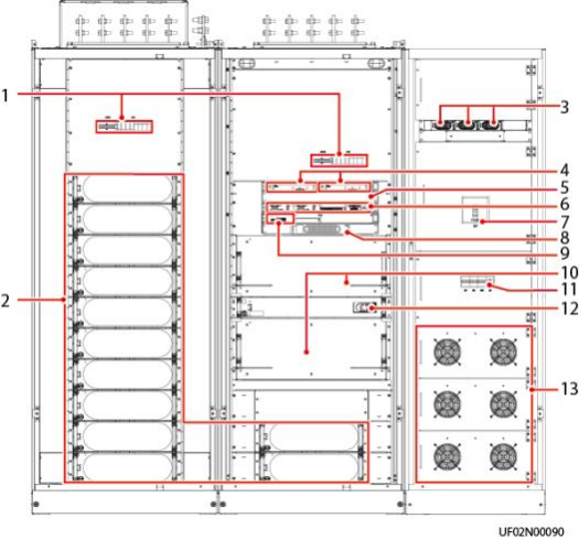 ( 1 )防雷器和防雷开关 (2)功率模块 (3)电感柜电源模块安装位置 (4)防雷盒 (5)假面板 (6)控制模块 ( 7 )电感柜总开关QF (8)旁路风扇电源模块 (9)智能检测卡 ( 10)旁路模块 ( 11 )电感柜风扇电源开关QS1 ( 12)旁路控制模块 ~ 4 ( 13)风扇