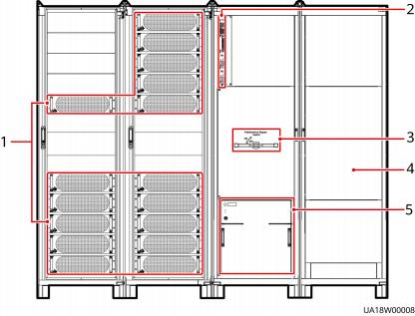 ( 1 )功率模块 (2)控制模块 (3)维修旁路开关 (4)配电模块盖板 (5)旁路模块