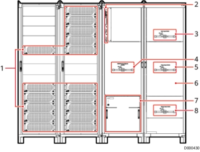 ( 1 )功率模块 (2)控制模块 (3)主路输入开关 (4)维修旁路开关 (5)输出开关 (6)配电模块盖板 ( 7 )旁路模块 (8)旁路输入开关 |