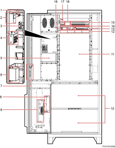 (1)电流互感器(选配) (2)智能电表(选配) (3)机柜接地排 (4)维护插座(选配) (5)HXC150S 热交换器 (6)蓝牙控制器(选配) (7)电子门锁(选配) (8)TCUA 控制盒 (9)TEC 模块 (10)电池安装空间 (11)用户设备安装空间 (12)整流模块安装空间 (13)用户接口模块 (14)监控模块 (15)直流配电单元