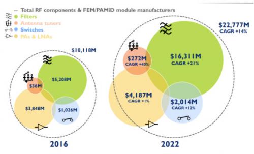 (3)智能机产业链:自给率较高,各大领域不乏亮点。 最后,让我们回到电子研究员最为熟悉的手机领域。参考TI的资料图,我们可以看出,智能手机内芯片方案极为复杂。除了主处理器之外,有数十颗模拟/数模混合芯片。且图中还有指纹识别芯片及射频芯片尚未标明(TI不研发相关产品,所以图中没有)。 手机芯片方案框图 参考资料:德州仪器,招商电子 如此繁杂的芯片方案初看无从下手,那让我们按照主处理器,电源管理,无线芯片,音频,显示,传感器,摄像头,指纹这一顺序逐个梳理。 主处理器芯片,目前国内主要有华为海思以及展讯科技。小米亦在2017年成功推出松果系列手机处理器。 电源管理芯片,圣邦股份和韦尔股份具有较强的竞争力,其中圣邦股份的背光驱动芯片在业内领先,而韦尔股份的DCDC,LDO等芯片优势明显。除此之外,还有台股上市公司矽力杰在该领域亦颇有造诣。 无线芯片方面,国内有三大射频PA公司,分别是中科汉天下,唯捷创新,国民飞骧。而射频开关则主要有正在IPO的卓胜微。射频芯片是增速最快的细分领域之一,2016年-2022年复合增长率高达14%。但国内要想实现进军高端手机,还需要一定时间。 手机射频芯片市场规模及增速预测 资料来源:Yole,招商电子 音频芯片领域,国内的主要玩家是一家三板上市公司,艾为电子。 显示屏相关芯片里,台湾厂商奕力,矽创,奇景,联咏等在显示屏驱动IC方面是行业龙头,且目前也有不少国内厂商在布局这一领域。 传感器方面:士兰微的加速度计目前已经进入了展讯的参考设计,18年加快向手机其他传感器的拓展。 摄像头CMOS芯片:豪威科技在2015年全球CMOS芯片市场中,占有约12%的市场份额,排名全球第三。预计2017年营收在8-10亿美元之间。 指纹芯片:主要是汇顶科技和思立微(兆易创新子公司),汇顶的指纹识别芯片在2017年底一举超越FPC,成为全球市场份额第一。而思立微也在2017年实现了市占率的翻倍。 指纹识别全球出货量及市占率 参考资料:招商电子 综合上述分析,我们可以看出,中兴通讯的三大应用领域里,芯片门槛最高的板块是RRU基站,这一领域要想实现国产替代,需要较长时间。光通信和手机产业链门槛相对较低,一些细分领域的国产芯片方案甚至于成为了国际龙头,但整体来看,还是偏低端应用。 本次中兴通讯的禁运事件,对于通信产业冲击较大,也敲响了半导体产业的警钟,自主可控不仅仅是口号,而是涉及到国家安全,国计民生的要务。我们不单要行远志,大张旗鼓建设晶圆厂,更要韬光养晦,从小处着力,支持本土芯片设计公司。 虽然当前国内芯片设计产业仍属薄弱,但我们相信全国这1380家芯片设计公司里,终归会走出巨头厂商。无论是TI模式的收并购整合,还是Linear的学术研究派,都值得我们本土的芯片设计公司借鉴。衷心希望可以在未来尽早解决中国电子产业的缺芯之痛。 |